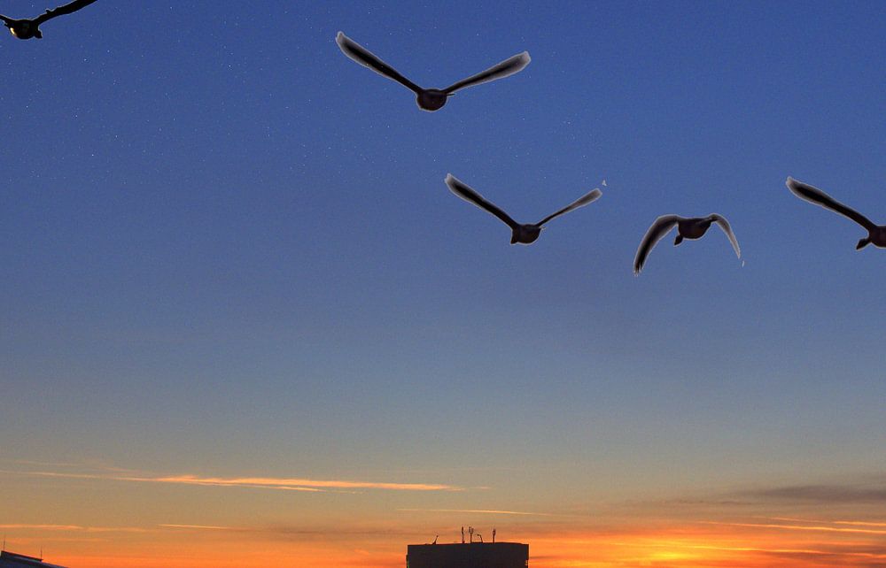 Photo panoramique de la Veltins Arena et de la Courtyard par l'hôtel Marriott et un mât de projecteur de l'ancien Parkstadion à Gelsenkirchen au coucher du soleil avec des bernaches du Canada volantes
