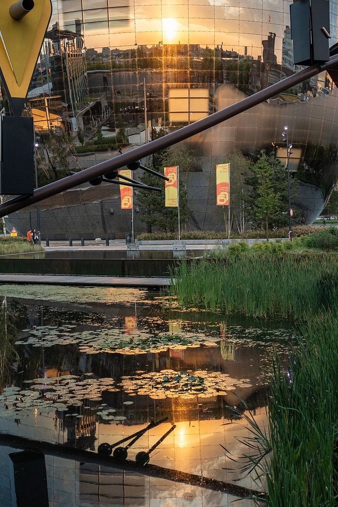 Cette photo enchanteresse capture la beauté du Depot Boijmans Van Beuningen au coucher du soleil, avec l'impressionnante œuvre d'art 'Sans Titre' d'Auke de Vries en avant-plan. La lueur chaude du soleil couchant se reflète magnifiquement dans la façade scintillante du bâtiment, créant une atmosphère magique.