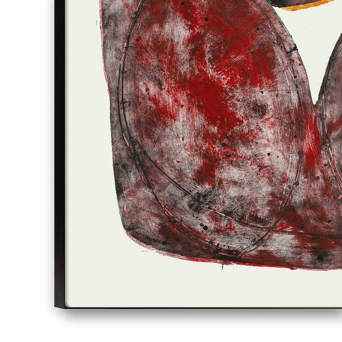 Le corps rouge remplit la moitié inférieure de l'œuvre, renforçant l'intensité émotionnelle. Les taches, les rayures et les traces d'impression confèrent à la figure une présence brute et tactile. L'ensemble ressemble à un moment de vigilance tranquille - une personne qui voit mais reste silencieuse.