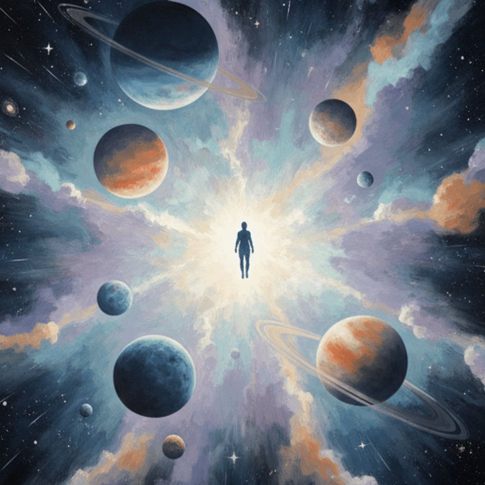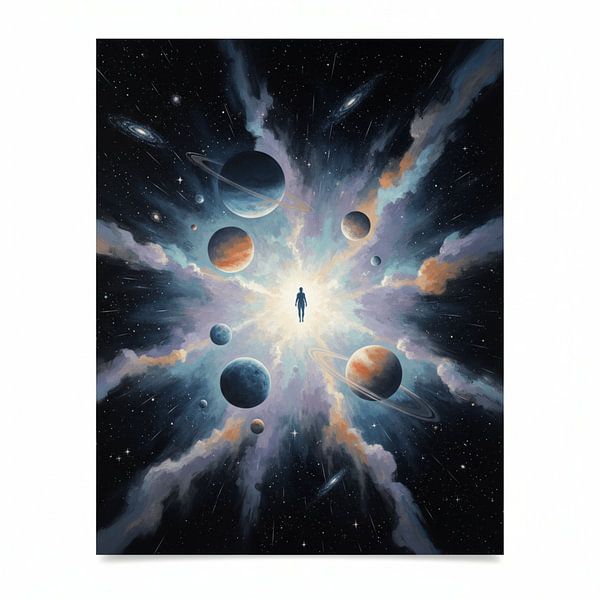 Solitary Drift in the Cosmos capture la solitude tranquille de l'humanité dans l'immensité du système solaire. Une silhouette humaine solitaire flotte, petite et lointaine, parmi les planètes, les étoiles et l'espace cosmique profond, évoquant des sentiments d'isolement, d'introspection et de profondeur émotionnelle. Cette œuvre d'art…