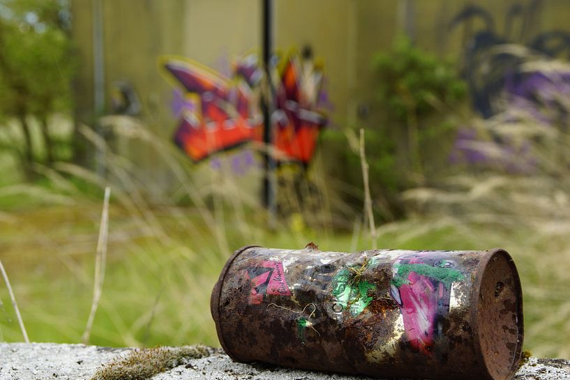 Au premier plan, une boîte de peinture fortement rouillée repose sur une surface en béton usée par les intempéries. Son métal est rongé par la rouille, sa surface est rugueuse, friable et parcourue de nuances brun foncé et rouge. Entre les traces d'oxyde, des restes de peinture vive – rose et verte – apparaissent, comme un souvenir muet de sa fonction initiale : créativité, expression, affirmation. Derrière la boîte, un bunker recouvert de graffitis se fond dans un arrière-plan flou. Des tons rouge et violet vifs rompent avec les couleurs ternes du site et contrastent nettement avec le premier plan délabré. La profondeur de champ douce attire délibérément le regard sur l'objet, vestige d'une appropriation artistique dans un espace au passé militaire. La photo a été prise sur le site de l'ancien dépôt de munitions de la Bundeswehr à Buseck, près de Giessen, lors d'une des dernières visites guidées officielles du site. Cette zone autrefois strictement protégée, qui servait au stockage de munitions, montre aujourd'hui des traces de délabrement, de nature et d'art urbain.