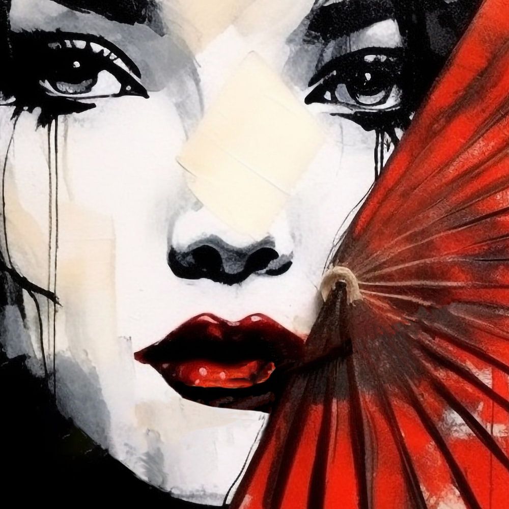 Portrait en noir et blanc d'une belle femme à moitié cachée derrière un éventail en mousse. Organique en utilisant du lin très fin. Une combinaison d'aquarelle, de couteau à palette et d'imagination crée un beau résultat quelque peu abstrait. Regard pénétrant. Convient à différents styles et tendances.