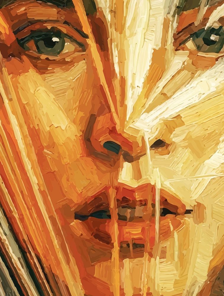 Peinture à l'huile dramatique où d'épais empâtements verticaux dans des tons chauds voilent le visage intense et émergent d'une femme, créant un puissant sentiment de mystère et d'émotion. Ce chef-d'œuvre texturé mêle abstraction et portrait, idéal pour les murs…