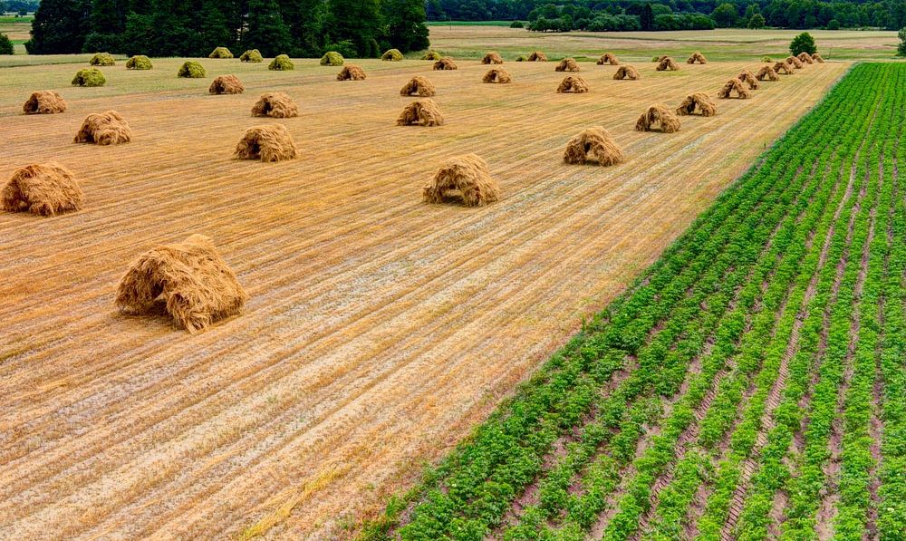 A propos de "Des bottes de foin en forme de hutte sont posées sur le pré."