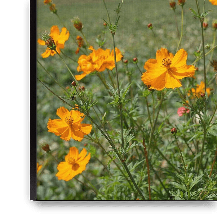 Des cosmos jaune d'or pour attirer les abeilles, ce qui améliore la pollinisation des melons. Dans la vallée de la Loire, mais ça aurait pu tout aussi bien être en Toscane, en Italie.