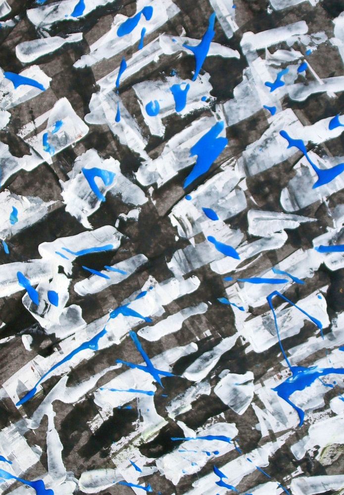 A propos de "Des éclats de couleur bleue entre un enchevêtrement de formes en noir et blanc."