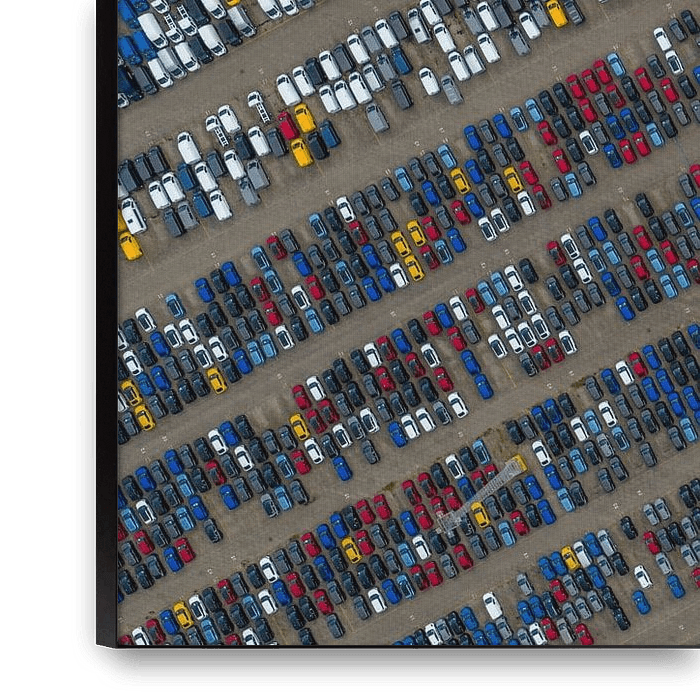 Cette photographie montre un vaste parking en perspective aérienne droite, avec des centaines de voitures disposées en rangs serrés et répétitifs. La composition souligne la nature graphique du paysage, dans lequel les lignes, les couleurs et les motifs jouent le rôle principal. Chaque voiture semble faire partie d'un système plus…