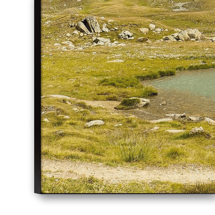 A propos de "Des lacs de montagne cristallins - une photographie alpine spectaculaire avec des reflets clairs et un panorama de montagnes. Acheter maintenant une peinture murale ou une toile et profiter de la nature."