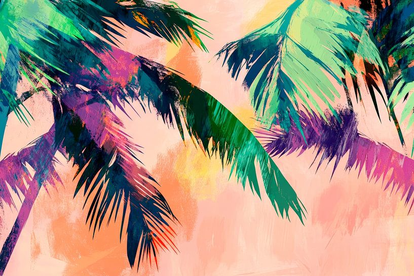 Achetez cette œuvre d'art de paysage Des palmiers tropicaux devant un doux jeu de couleurs par Poster Art Shop sur toile, aluminium, ArtFrame ou photographie (encadrée), impression d'art en haute qualité et tout format.
