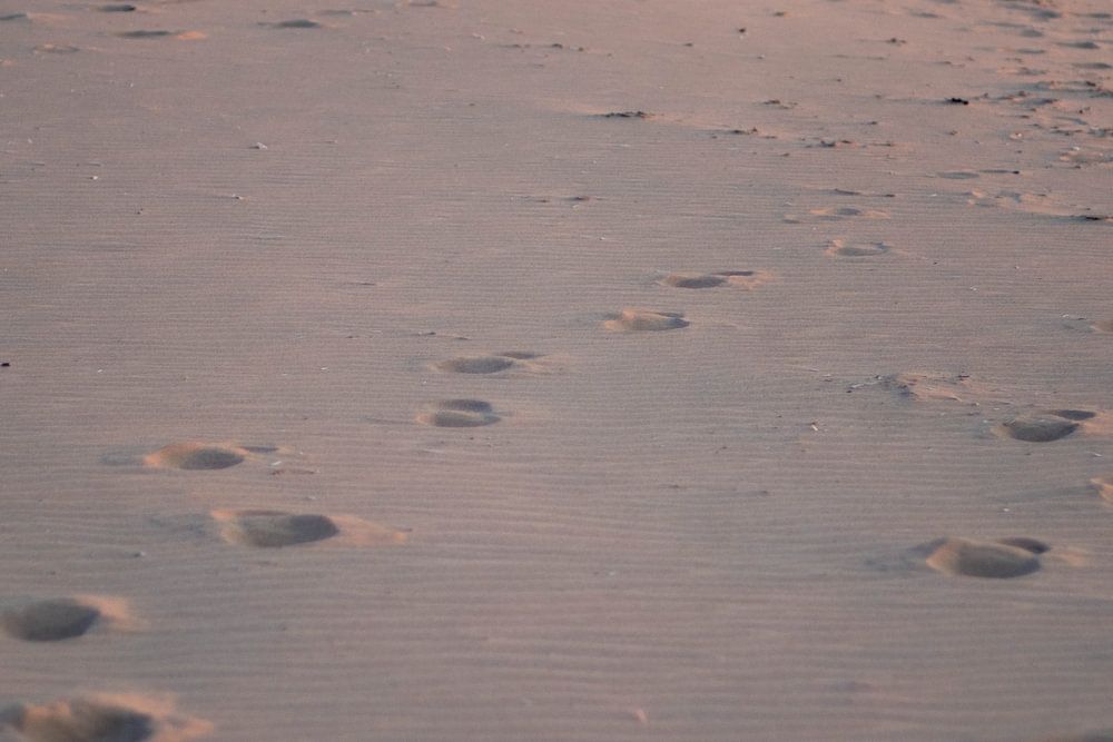 Après une courte marche, je me suis retourné pour regarder la mer. Ensuite, je n'ai pas pu résister à l'envie de photographier les traces de pas dans le sable.
