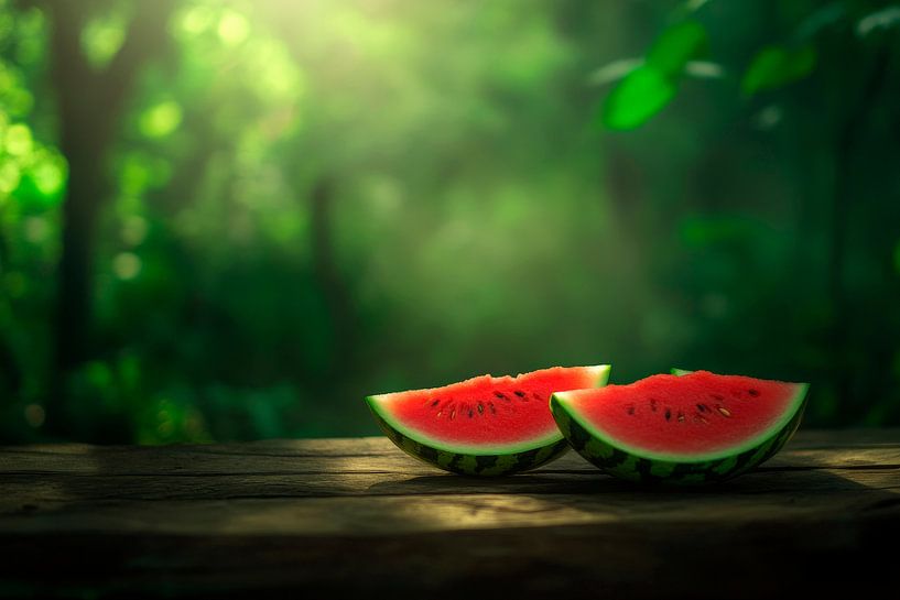 Des morceaux de pastèque juteux sont posés dans une douce lumière sur une planche de bois rustique, entourée d'une forêt verte et mystique. La couleur rouge vive et les détails rafraîchissants invitent littéralement à la dégustation. Ce tableau donne à ta cuisine ou à ta salle à manger un air frais et estival et crée une ambiance…
