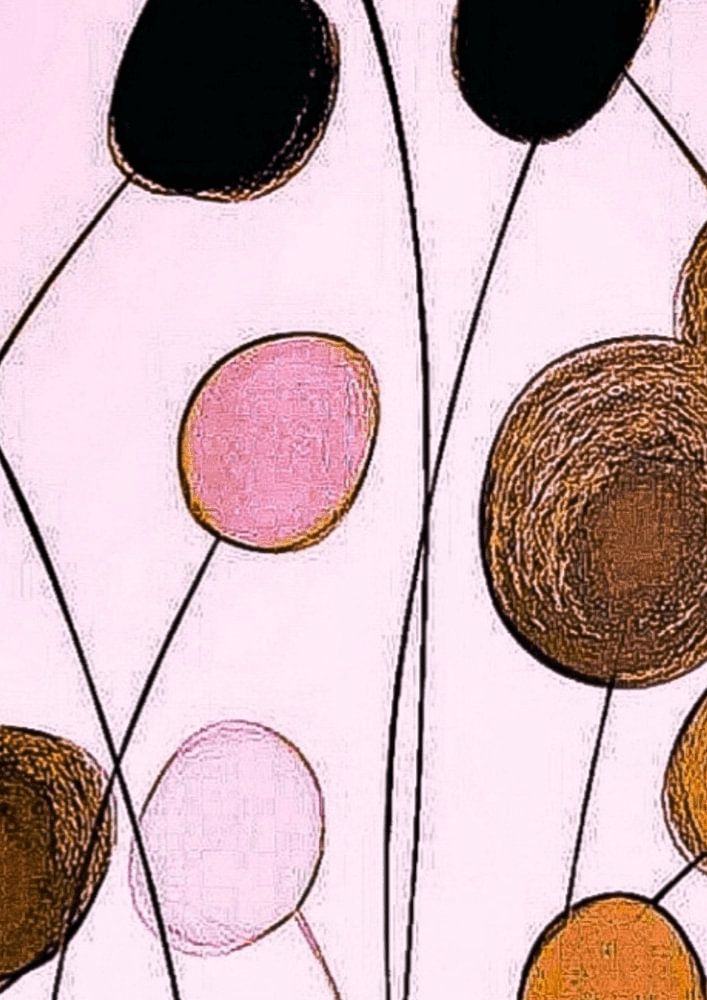 Cette image montre une représentation abstraite de plantes ou de fleurs avec des tiges longues, courbes et fines qui s'étendent dans différentes directions. Au bout des tiges se trouvent des formes ovales d'apparence organique dans différentes teintes - dont le noir, le brun, l'or et le rose.