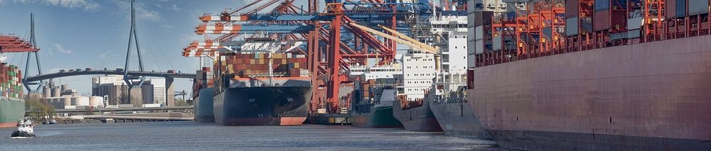 Achetez cette photo Des porte-conteneurs et des grues portuaires dans un port animé par Jonas Weinitschke sur toile, aluminium, ArtFrame ou photographie (encadrée), impression d'art en haute qualité et tout format.