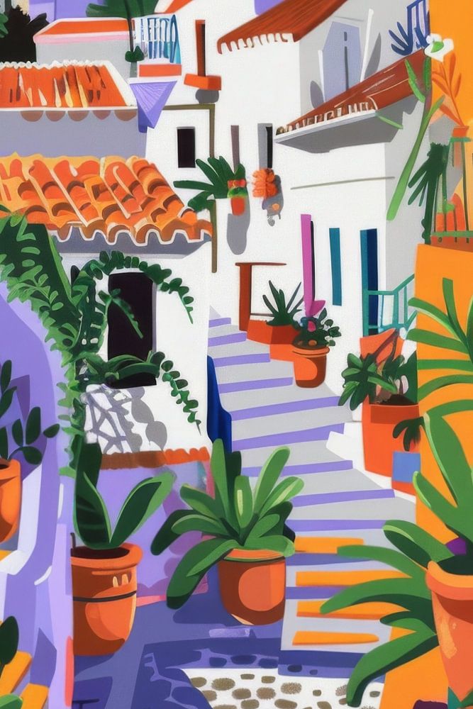L'image montre un escalier pittoresque dans un village méditerranéen animé. Les pots de fleurs colorés et les maisons d'un blanc éclatant aux toits de terre cuite sont frappants. Les douces terrasses et le bleu lumineux du ciel créent une atmosphère accueillante qui invite à s'attarder et souligne la beauté de cet environnement charmant.