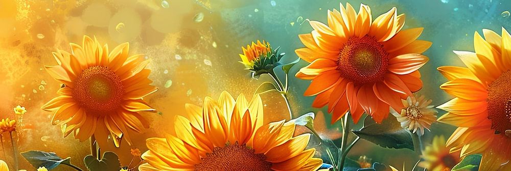 Une série de tournesols lumineux représentés dans un style aquarelle sur un fond ensoleillé.
