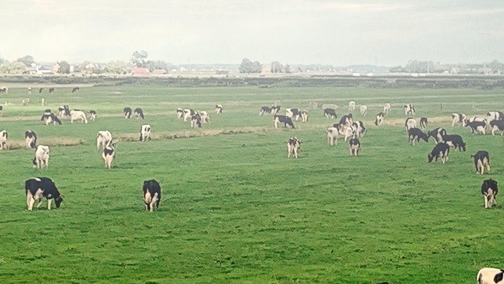 Un paysage typiquement hollandais. Une prairie plate avec une vue panoramique et pleine de vaches en noir et blanc et un village au loin dans un ciel bleu clair avec de gros nuages blancs qui flottent. Vous ne voulez pas vivre dans un tel pays ?