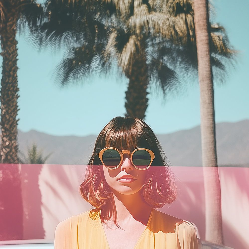 Entrez dans un monde de rêve, de soleil, de palmiers et de style vintage avec Desert Dreaming. Cette œuvre d'art capture l'essence d'un voyage en voiture relaxant à travers un paysage d'été. Une femme élégante portant des lunettes de soleil rétro respire l'élégance, entourée d'une voiture classique, de grands palmiers et d'un fond désertique chaleureux. La lueur rose et les ombres douces confèrent à l'image un caractère onirique et cinématographique.