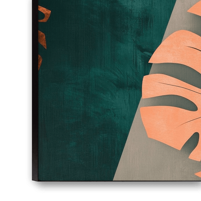 Un jeu fascinant de couleurs et de formes se déploie, dans lequel de luxuriantes feuilles de monstera s'animent dans une chaude teinte cuivrée. Le fond vert profond contraste puissamment avec les surfaces grises douces qui soulignent l'élégance du design. Cette œuvre d'art capture parfaitement le lien harmonieux avec la nature et l'esthétique contemporaine.