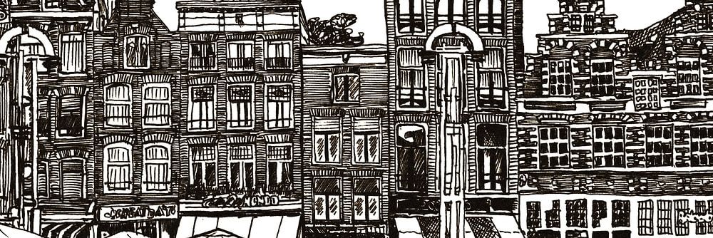 Dessin du centre d'Amsterdam Nieuwmarkt en sépia Dessin au trait, conception pentecôtiste.