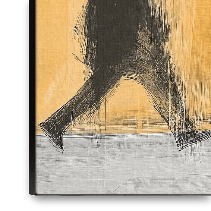 Cette œuvre d'art unique allie la puissance du minimalisme à un magnifique jeu de lignes. Elle montre des silhouettes de personnes en mouvement, la lumière et l'ombre se combinant pour créer un ensemble dynamique. L'association de couleurs frappantes (jaune, blanc, noir et gris) rend ce dessin parfait pour les intérieurs modernes. Que…