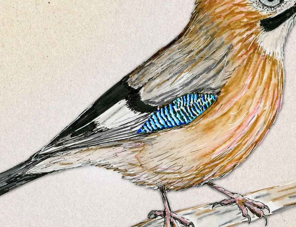 Le dessin d'un geai. L'oiseau est dessiné au marqueur et aux feutres. Le fond est une structure de papier chaud. On peut voir l'oiseau de côté, où les plumes bleues de l'aile se détachent joliment.