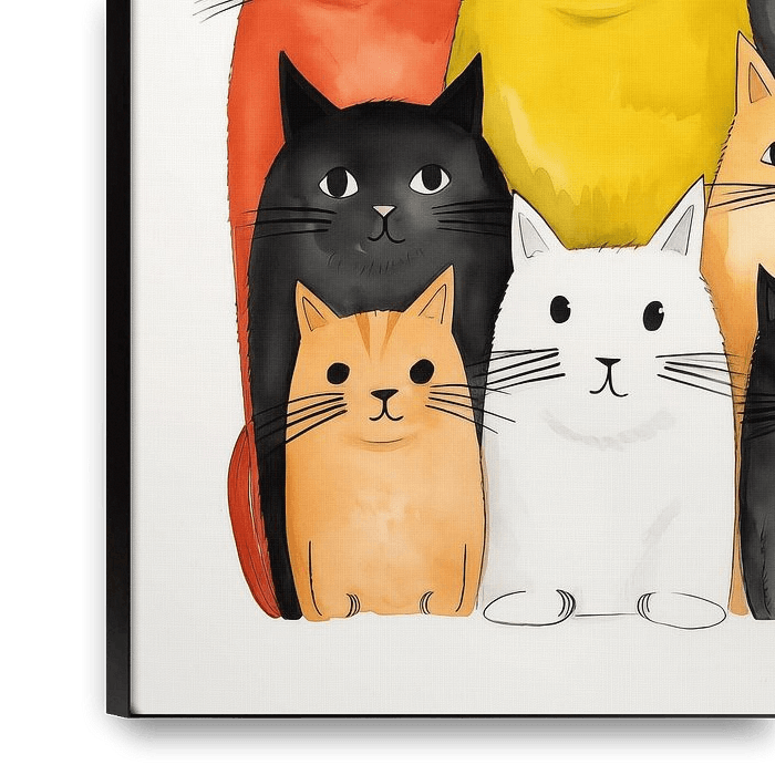 Ce charmant dessin capture la scène chaleureuse d'un groupe de chats divers, paisiblement regroupés et regardant curieusement vers l'observateur. La diversité des chats est représentée par leur fourrure colorée dans des tons de blanc, de noir, de gris, de jaune et d'orange, ce qui ajoute à la vivacité de la scène.