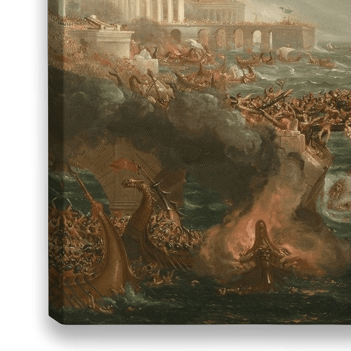 Le quatrième tableau, Destruction, a presque la même perspective que le troisième, bien que l'artiste ait pris un peu de recul pour permettre une scène plus large de l'action, et se soit déplacé presque au centre du fleuve. L'action est le sac et la destruction de la ville, au cours d'une tempête vue de loin. Il semble qu'une flotte de guerriers ennemis ait renversé les défenses de la ville, remonté la rivière et s'affaire à tirer sur la ville et à tuer et violer ses habitants. Le pont traversé par la procession triomphante est brisé, un pont de fortune qui traverse des tensions sous le poids des soldats et des réfugiés. Les colonnes sont brisées, le feu s'échappe des étages supérieurs d'un palais sur les rives de la rivière.