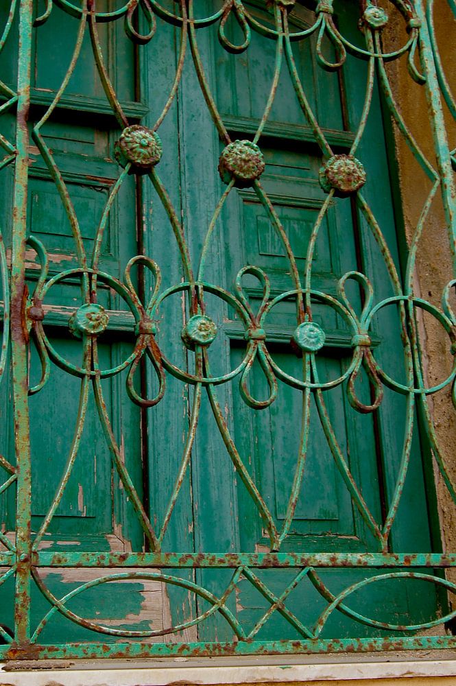 La couleur verte des portes et de la grille forme une belle contrepartie au mur jaune sable, autrement presque ennuyeux.