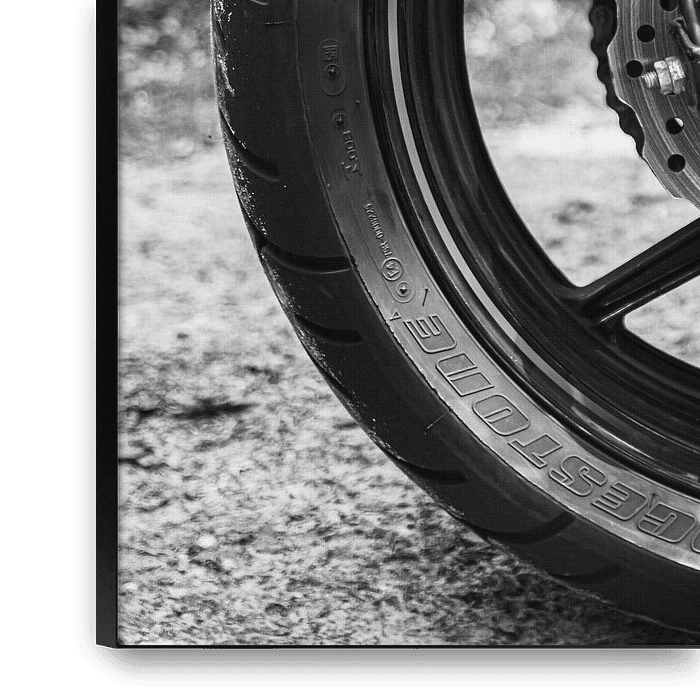 Une photo de détail d'une roue arrière d'un moteur. Vous voyez juste un bord de l'échappement. Vous pouvez voir clairement le profil sur les pneus.