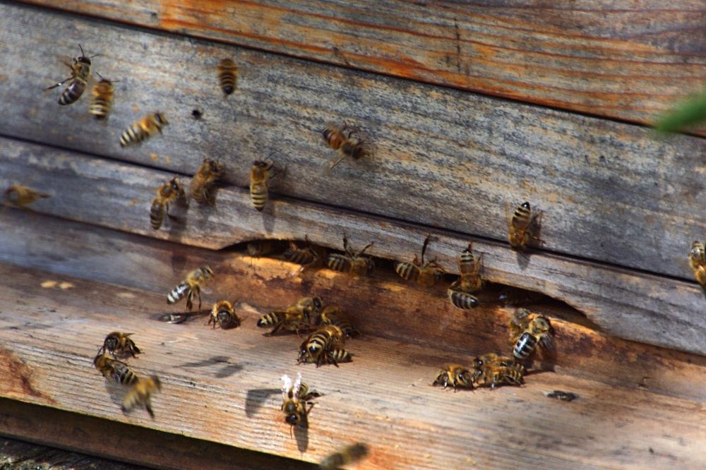 Planche d'atterrissage avec ouverture d'entrée d'une ruche en bois