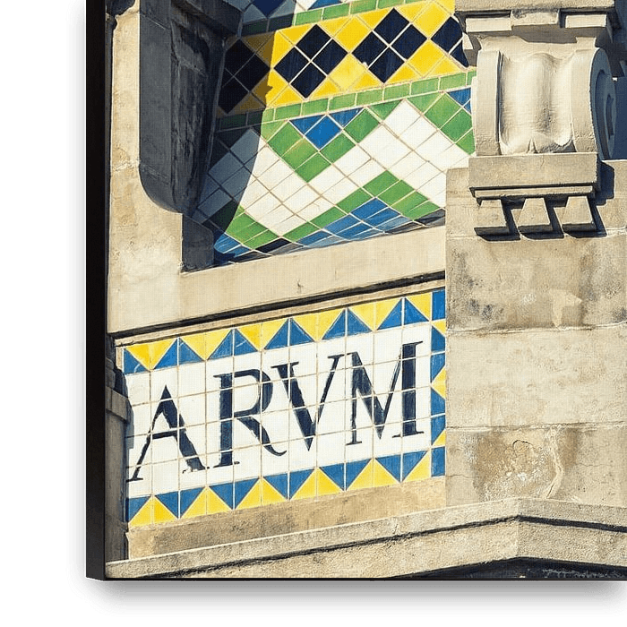 Gros plan sur une mosaïque ornant la façade d'un bâtiment, avec des motifs géométriques et des couleurs vives, principalement le bleu et le jaune. Un texte en latin est intégré dans le carrelage décoratif, suggérant une signification historique ou culturelle.