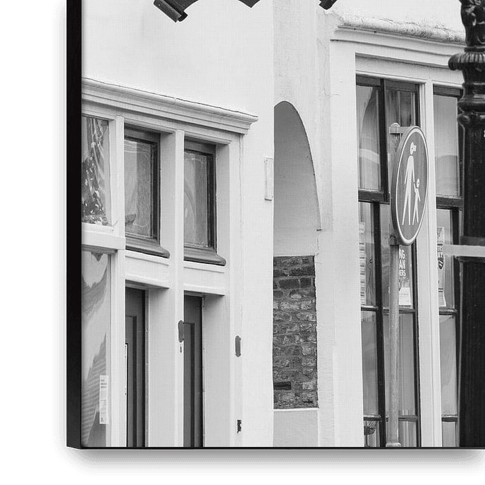 Zwartwit beeld van gevels in het centrum van Utrecht. Foto gemaakt met telelens om het patroon van de raamkozijnen te benadrukken.