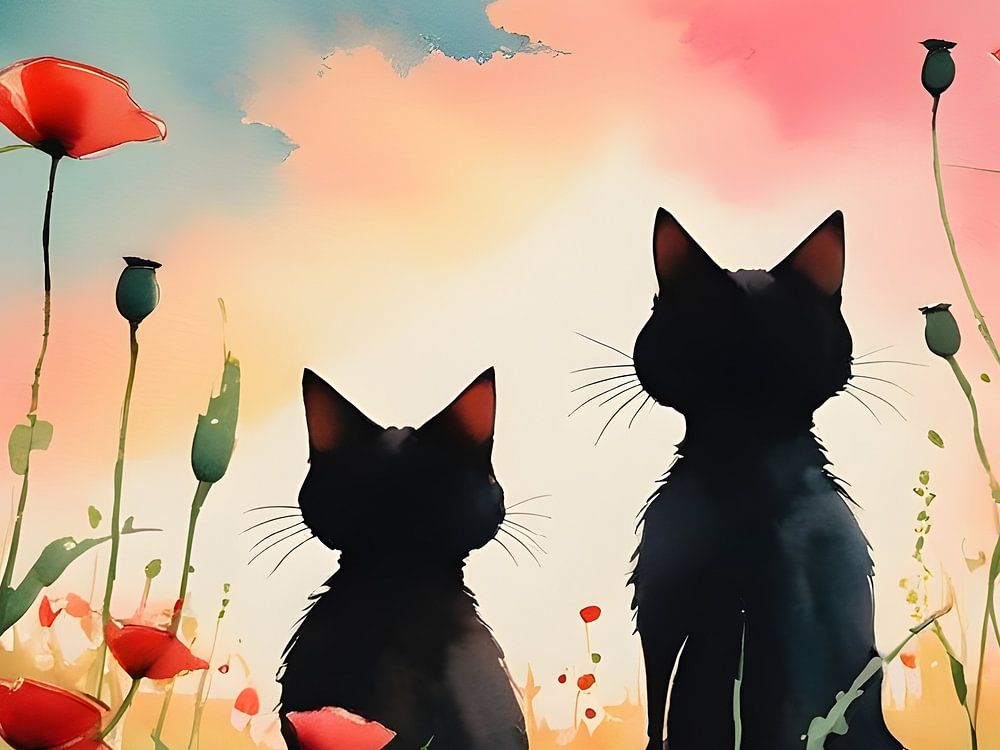 Cette œuvre représente deux chats assis au milieu de coquelicots luxuriants, contemplant un ciel serein teinté de douces couleurs pastel. La simplicité des silhouettes des chats contraste magnifiquement avec les coquelicots d'un rouge éclatant, évoquant un sentiment de calme et de contemplation. La transition subtile des couleurs dans le ciel et la lumière tombant à travers les fleurs confèrent à la composition une atmosphère de rêve.