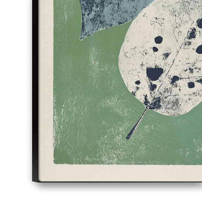 Une ode à la simplicité de la nature : cette œuvre d'art représente deux feuilles sur un fond vert, exécutée dans le style d'une impression sur bois. Les bords doux, la faible résolution et la variation subtile des couleurs - du gris foncé au bleu marine clair - confèrent à l'œuvre un caractère rustique et artisanal.