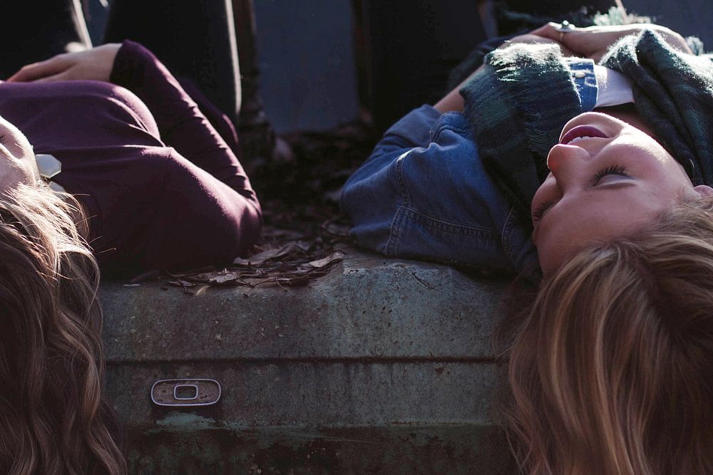 Deux filles allongées sur une vieille voiture avec les cheveux défaits.