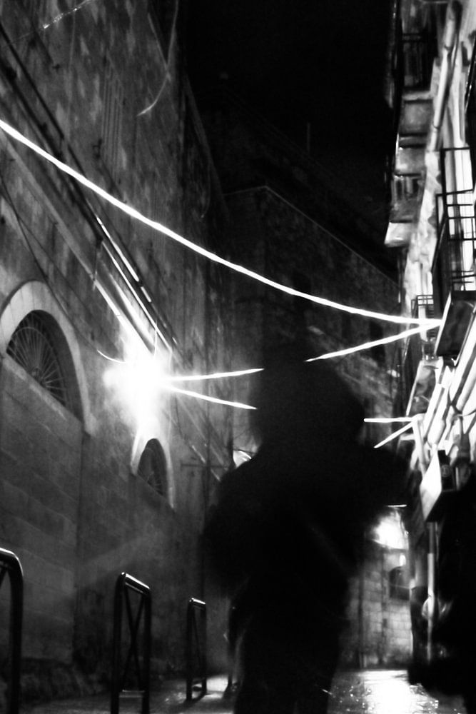 Deux mystérieuses silhouettes de personnes, photo en noir et blanc. Rues étroites et sombres de la vieille ville, Israël, Jérusalem