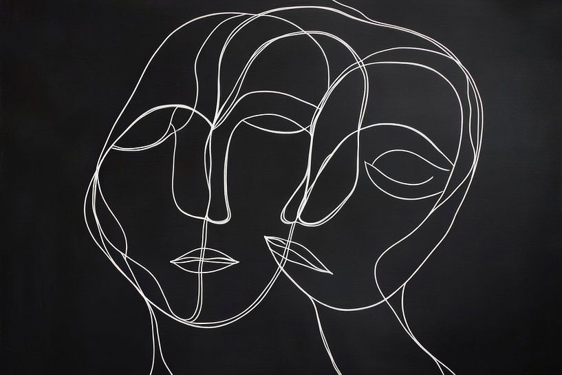 Deux visages stylisés, élégamment représentés par de fines lignes blanches sur un fond noir profond, créent un duo d'émotions captivant. Cette composition minimaliste dégage une impression de calme et d'intimité, idéale pour la chambre à coucher ou le salon, où elle crée un sujet de conversation et apporte une touche d'art moderne.