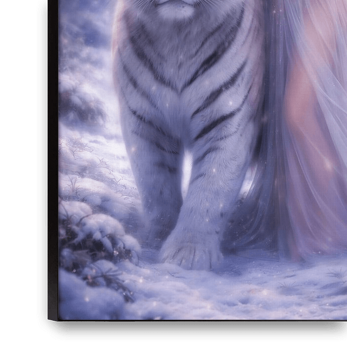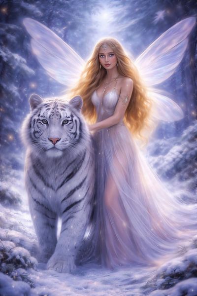 Acheter ce art numérique Deva et le tigre blanc dans la neige par Ivonne Fuhren-van de Kerkhof sur toile, aluminium, ArtFrame ou photographie (encadrée), impression d'art en haute définition et tout type de format.