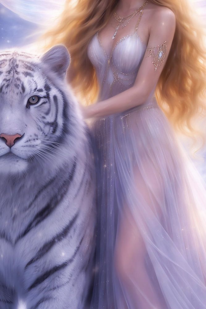 Cette œuvre d'art Procreate réalisée à la main représente une deva en relation amoureuse avec un majestueux tigre blanc dans un paysage serein et enneigé. La deva porte une robe et des ailes transparentes, qui se combinent avec les tons blancs et bleu-gris de la scène pour créer un sentiment de légèreté, de pureté et d'harmonie…