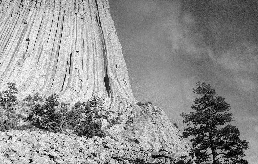 Vue sur Devils Tower, avec champ de blocs de basalte et conifères, le soir au coucher du soleil.