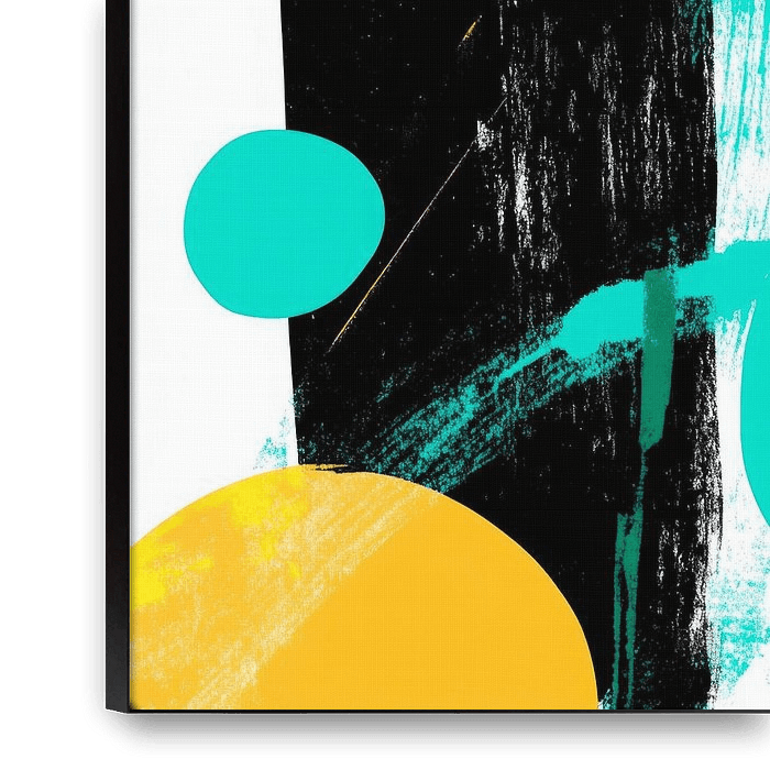 Énergique et moderne, un jeu de couleurs vives et de formes dynamiques se déploie. Les lignes noires contrastées et les accents brillants de turquoise et de jaune donnent vie à l'image. Un accroche-regard parfait pour le salon, qui enflamme chaque conversation et favorise l'inspiration créative.