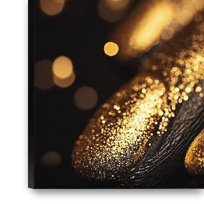Gros plan intrigant sur des paillettes dorées recouvrant le bout des doigts, créant un effet luxueux et scintillant. Le rendu détaillé montre chaque grain d'or qui orne la peau, renforçant l'impression d'élégance et de sophistication. Parfaite pour les intérieurs modernes à la recherche d'une touche de glamour, cette image évoque un…