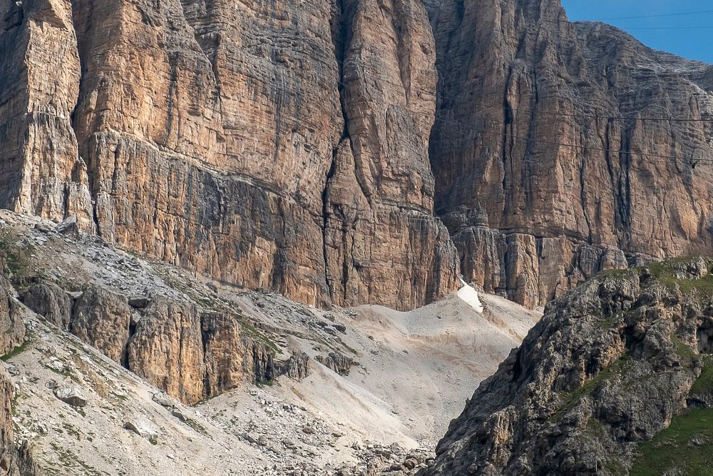 n téléphérique monte en été avec les touristes au sommet de l'impressionnant massif de la Sella dans les Dolomites au Tyrol du Sud, en Italie.