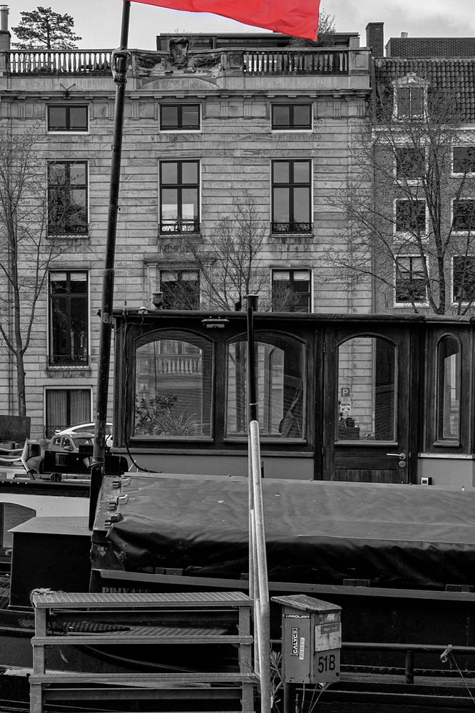Le drapeau d'Amsterdam flotte audacieusement sur le mât d'une péniche sur l'Amstel. Les Amstellodamois aiment le Mokum ! Dans cette œuvre en noir et blanc, le drapeau est représenté en couleur.