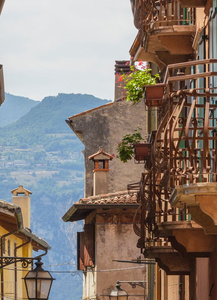 Doorkijkje met ijzeren balkons aan het Gardameer par Ed de Cock