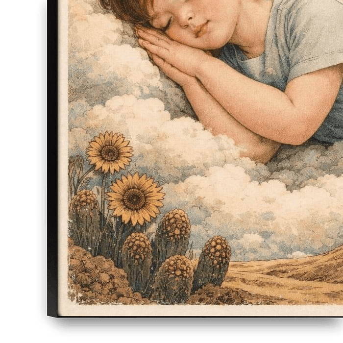 Cette illustration enchanteresse représente un enfant paisible dormant doucement sur un lit de nuages, sous une lune lumineuse et un ciel rempli d'étoiles. Inspirée des contes de fées anciens et des récits oniriques, cette scène évoque l'innocence, le calme et la douce magie des rêves au moment du coucher. La présence d'une lune à…