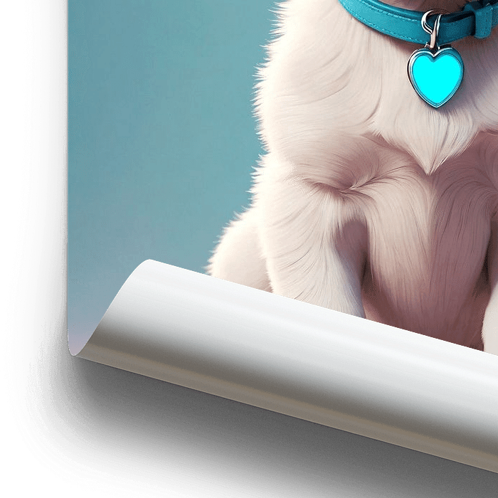 Portrait en I.A. d'une chienne blanche nommée Bella avec de beaux yeux bleus et un collier bleu avec un cœur. L'arrière-plan a des couleurs pastel douces en rose et bleu.