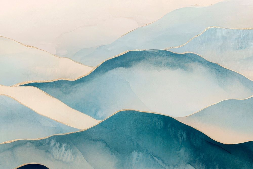 Un doux voile de bleus profonds caresse les montagnes ondulées qui apparaissent floues au loin. Cette composition harmonieuse évoque le calme et la sérénité, parfaite pour une chambre à coucher ou une salle de méditation, où elle crée une atmosphère paisible et emplit la pièce d'une touche de nature.