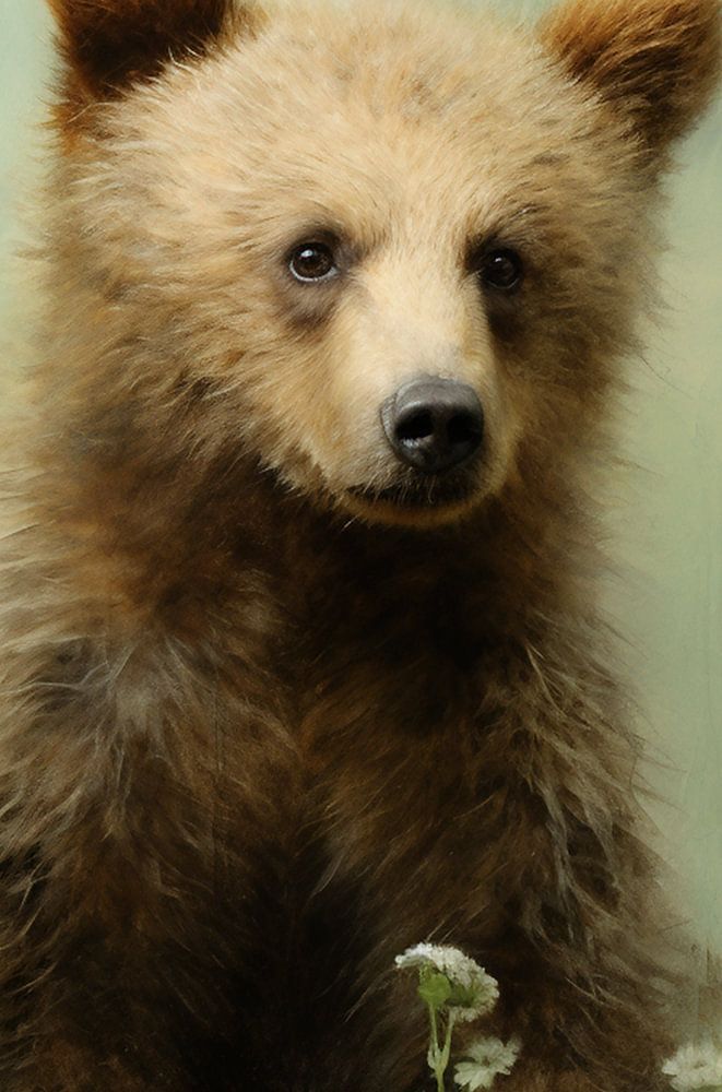 Un ours brun est assis dans les hautes herbes et regarde vers l'avant avec un regard calme, presque rêveur. La combinaison des couleurs douces et de la pose calme donne à cette image un aspect paisible et naturel.