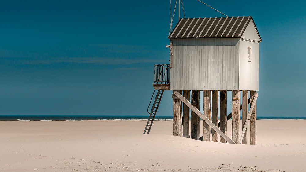 Une photo du Drenkelingenhuisje sur Terschelling, mais légèrement différente. La combinaison des nuances de gris et de la couleur jaune crée une image de bonne humeur de cette performance. La mer, la grande plage et les dunes procurent un sentiment de liberté et de vacances.